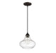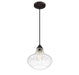 Two-tone appeal is easy to get with this 1-light mini pendant. Showcasing a schoolhouse-inspired shade of clear seeded glass, oil rubbed bronze finished hardware and black cord, it adds a touch of industrial flair to any space. Use this pendant alone or in groups for a huge style impact! It is 10" in height and 10" in width, plus it comes with 120" of cord to let you adjust the hanging height as needed. It uses 1 standard size bulb of up to 60 watts, is LED compatible and is dimmable.