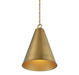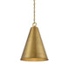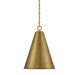 This Meridian 1-light pendant flaunts an opaque cone-shape shade and a chain with interlocking circles, making for a fetching geometric look. It is finished in natural brass and is great for bringing focused, directed light to areas like kitchen islands. This pendant is 27.75" in height and 18" in width, plus it includes 120" of chain to let you adjust the hanging height as needed. This pendant uses 1 standard size bulb of up to 60 watts, is LED compatible and is dimmable.