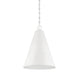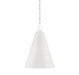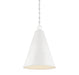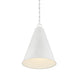 This Meridian 1-light pendant flaunts an opaque cone-shape shade and a chain with interlocking circles, making for a fetching geometric look. It is finished in white and is great for bringing focused, directed light to areas like kitchen islands. This pendant is 27.75" in height and 18" in width, plus it includes 120" of chain to let you adjust the hanging height as needed. This pendant uses 1 standard size bulb of up to 60 watts, is LED compatible and is dimmable.