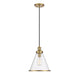 Looking for vintage-inspired lighting style? Look no further than this Meridian 1-light pendant! It flaunts a clear glass shade with natural brass detailing that goes perfectly with the black hanging cord. This pendant would look great flying solo or as part of a grouping. 12.75" height, 11" width. Max height 133". Max 60 watt bulb, standard size A19 bulb recommended. LED bulb compatible. Supplied with 120" of cord.