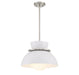 This 1-light pendant brings a big dose of midcentury-inspired style in a small package! A white solid metal shade focuses and directs the light while an opal glass shade softens the glow. Collar detailing finished in Brushed Nickel adds even more style. 9.5" height and 15" width. Adjustable height ranges from 20" to 38". Uses 1 standard size bulb with a max of 60 watts (not included). Supplied with three 9.5" downrods.