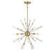 Iconic Sputnik style is reinvented with a fun new form in this 5-light pendant. Clear crystal accents decorate each arm of the structure and pair nicely with the exposed bulbs. Natural Brass finish. 26" height and 26" width. Adjustable height ranges from 32" to 80". Uses five candelabra size bulbs with a max of 60 watts per bulb (not included). Supplied with four 12" downrods and one 6" downrod. Uses a dual mount hanging system for flat or sloped ceilings.