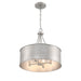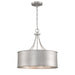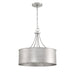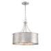 This 4-light pendant is the perfect way to bring timeless allure to any space. The drum-shaped solid metal shade, finished in Antique Silver, creates an eye-catching and appealing glow. 17.5" height and 18" width. Uses candelabra size bulbs, max 60 watts per bulb. LED bulb compatible. Comes with 120" of chain.