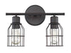 This industrial-style 2-light bath bar offers thin wire cage shades over exposed light sources and an Oil Rubbed Bronze finish. 11" in height and 15" in width.