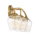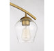 Shape up your bath lighting style with this 3-light bathroom vanity light! Between the curving arm, the wineglass-style clear glass shades and the circular backplate, it's the perfect way to brighten your bath. Natural brass finish. Can be mounted with shades facing up or down. It is 10.38" in height and 24" in width. It extends 7.13" from the wall. It uses 3 standard size bulbs of up to 60 watts per bulb, is LED compatible and is dimmable.