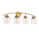 Shape up your bath lighting style with this 4-light bathroom vanity light! Between the curving arm, the wineglass-style clear glass shades and the circular backplate, it's the perfect way to brighten your bath. Natural brass finish. Can be mounted with shades facing up or down. It is 10.38" in height and 32.75" in width. It extends 7.13" from the wall. It uses 4 standard size bulbs of up to 60 watts per bulb, is LED compatible and is dimmable.