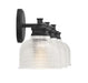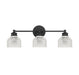 Vintage style inspiration is beautifully modernized in this 3-light bathroom vanity light. It features a streamlined style with shades of textured clear halophane glass, a circular backplate and a matte black finish. Can be mounted with the shades facing up or down. 9.25" in height and 24.25" in width. Extends 6.5" from the wall. Uses 3 standard size bulbs of up to 60 watts per bulb, is LED compatible and is dimmable.