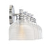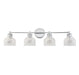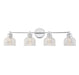 Vintage style inspiration is beautifully modernized in this 4-light bathroom vanity light. It features a streamlined style with shades of textured clear halophane glass, a circular backplate and a chrome finish. Can be mounted with the shades facing up or down. 9.25" in height and 32" in width. Extends 6.5" from the wall. Uses 4 medium bulbs of up to 60 watts per bulb, is LED compatible and is dimmable.