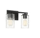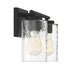 Make a big impact when you change out your old bathroom lights for this 2-light bath vanity light. It has a sleek look with intriguing shades of clear swirl glass and a matte black finish. Can be mounted with the shades facing up or down. 8.63" in height and 15" in width. It extends 5.5" from the wall. Uses 2 standard size bulbs of up to 60 watts per bulb, is LED compatible, is dimmable and is damp area rated.
