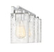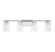 Make a big impact when you change out your old bathroom lights for this 4-light bath vanity light. It has a sleek look with intriguing shades of clear swirl glass and a chrome finish. Can be mounted with the shades facing up or down. 8.63" in height and 32" in width. Extends 5.5" from the wall. It uses 4 standard size bulbs of up to 60 watts per bulb, is LED compatible, is dimmable and is damp area rated.