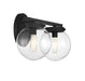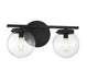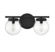 Add a bubbly look to your bath with this Meridian 2-light bath bar! Its streamlined design features globes of clear glass, a shape that is echoed in the circular backplate. This light will really pop in bathrooms with contemporary, modern and midcentury modern styles. Finished in matte black, it is also damp area rated. This bath light is 8" in height and 16" in width. It extends 7.25" from the wall and can be mounted with the shades facing up or down. It uses 2 candelabra size bulbs of up to 60 watts each, is dimmable and is LED compatible.