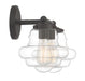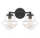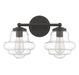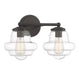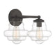 Bring a bold touch of vintage schoolhouse style to any space with this 2-light bath vanity light. It features an oil rubbed bronze finish and curving clear glass shades with eye-catching detailing. 10" height, 16.5" width. Uses standard size bulbs, max 60 watts per bulb. LED bulb compatible.
