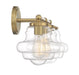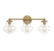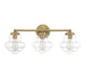 Bring a bold touch of vintage schoolhouse style to any space with this 3-light bath vanity light. It features a natural brass finish and curving clear glass shades with eye-catching detailing. 10" height, 26" width. Uses standard size bulbs, max 60 watts per bulb. LED bulb compatible.