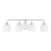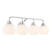 Freshen up your bathroom with the sleekly timeless style of this 4-light bath bar, which features orb-shaped shades of white opal glass that are open at the bottom and a versatile Chrome finish. It is 8.25" in height, 32" in width and extends 7.75" from the wall. It uses 4 standard size bulbs of up to 60 watts per bulb. Bulbs not included.