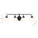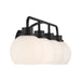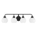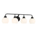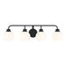 Freshen up your bathroom with the sleekly timeless style of this 4-light bath bar, which features orb-shaped shades of white opal glass that are open at the bottom and a versatile Matte Black finish. It is 8.25" in height, 32" in width and extends 7.75" from the wall. It uses 4 standard size bulbs of up to 60 watts per bulb. Bulbs not included.