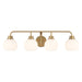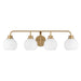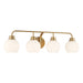 Freshen up your bathroom with the sleekly timeless style of this 4-light bath bar, which features orb-shaped shades of white opal glass that are open at the bottom and a versatile Natural Brass finish. It is 8.25" in height, 32" in width and extends 7.75" from the wall. It uses 4 standard size bulbs of up to 60 watts per bulb. Bulbs not included.