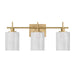 Brighten up your bath easily and beautifully with this 3-light bath bar, which showcases shades of strie glass featuring dazzling swirls that draw the eye, soften the glow and work beautifully with the Natural Brass finish. It is 9.75" in height, 22" in width and extends 6.5" from the wall. Uses three standard size bulbs of up to 60 watts per bulb. Bulbs not included.