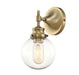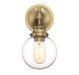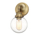 Get industrial with this bold 1-light sconce, offering an orb-shaped shade of clear glass and a Natural Brass finish. 10" in height and 5.13" in width. Extends 6.5" from the wall.