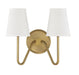 This clean and crisp 2-light wall sconce has a minimalistic look that makes it ideal for adding light to a room without too much fuss. It is finished in natural brass and topped off with white fabric shades. 11.25" in height and 13" in width. Extends 8" from the wall. Uses 2 candelabra size bulbs of up to 60 watts each, is LED compatible, is dimmable and is damp area rated.