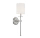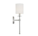 Add a boost of classic elegance to any room with this Meridian 1-light wall sconce. It has a shade of white fabric that goes well with the brushed nickel finish, creating a style that is ideal for traditional or transitional decors. This sconce is 20" in height and 5" in width. It extends 7" from the wall and uses one candelabra size bulb of up to 60 watts. It is dimmable and LED compatible.