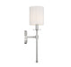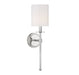 Add a boost of classic elegance to any room with this Meridian 1-light wall sconce. It has a shade of white fabric that goes well with the polished nickel finish, creating a style that is ideal for traditional or transitional decors. This sconce is 20" in height and 5" in width. It extends 7" from the wall and uses one candelabra size bulb of up to 60 watts. It is dimmable and LED compatible.