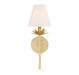This Meridian 1-light wall sconce features a simply sleek look with a floral bobeche beneath the white linen shade for a touch of organic beauty. The True Gold finish adds a dose of glamour with a rustic edge. This sconce looks great when used solo or in groupings! 17" height, 6" width, extends 7.25" from the wall. Max 60 watt bulb, candelabra size C11 bulb recommended. LED bulb compatible. Damp area rated.