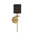 This Meridian 1-light wall sconce features a simply sleek look with a flower-like bobeche beneath the black linen shade. The True Gold finish adds a dose of glamour with a rustic edge. This sconce looks great when used solo or in groupings! 18.5" height, 5" width, extends 6.25" from the wall. Max 60 watt bulb, candelabra size C11 bulb recommended. LED bulb compatible. Damp area rated.