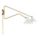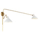 This Meridian 2-light adjustable wall sconce showcases curving vintage-inspired shades on long, dramatically angled arms and is finished in a stylish pairing of white with natural brass. 20.5" height, 86" width, extends up to 52" from the wall. Max 60 watts per bulb, standard size A19 bulbs recommended. LED bulb compatible. Can be hard-wired or plugged in.