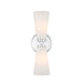 Timelessly beautiful and elegant, this 2-light sconce is sure to brighten your home in style. Its alluring white fluted glass shades add a thoughtful touch of texture and pair nicely with the Chrome finish. The height is 14.5", the width is 5.125" and it extends 5.5" from the wall. Uses 2 candelabra size bulbs of up to 60 watts per bulb. Bulbs not included.