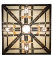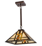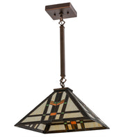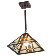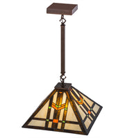Clean geometric lines, structural details and meticulous attention to quality are hallmarks of this lighting fixture. This appealing Mission styled pendant features colorful interlocking blocks of Green and Sunburst art glass with Bark Brown Granite Glass to form stylized wheat stalks on a Creamy Beige background. The handcrafted art glass shade is embraced by hardware finished in Mahogany Bronze. The perfect illuminating centerpiece to enhance any decor for fine homes, restaurants, boutiques and hotels. Custom sizes, styles, colors and dimmable energy efficient lamping options are available. The fixture is UL and cUL listed for damp and dry listings.