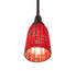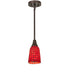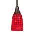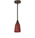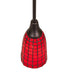 The stunning Terra Roja Mini Pendant features brilliant Ruby Red glass that cascades in a Geometric grid on an elongated handcrafted shade. The art glass shade is created using the famous Meyda Tiffany copperfoil construction technique and is complemented with a warm Mahogany Bronze finish. You can install in groups to make a design statement over islands, tables, counters, and bars. The Terra Roja Mini Pendant is featured in our American-designed, handcrafted Stained Glass Lighting Collection. UL and cUL listed for dry and damp locations. Each shade is a unique work of art, featuring color variations derived from the natural ingredients inherent in the glass.