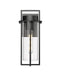 A bold steel framework encases a sparkling clear glass cylinder, giving the Russell Collection a unique appearance. These outdoor sconces are single, downward-facing lights that combine sleek styling with a powder coat black finish. Vintage-style elongated Edison bulbs will complete the look for an exciting addition to any entryway.