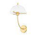 Atala leans wholeheartedly into the mushroom trend with its elongated arm and large dome shade. The graceful curve upwards seems to exude confidence as the fixture emits an inviting glow. Distinctive jewelry-like clasps support the shade while adding decorative flair. Perfect in a vanity setting, this stylish sconce is available in an Aged Brass or True Bronze finish.