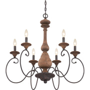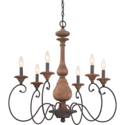 Natural aesthetics and a feminine style bring the European inspired design of the Auburn Collection to great heights. The finish is a textured and rich Rustic Black with an aged appeal that is featured on the scrolling arms and candle sleeves. The beautiful walnut stain highlights the unique wood patterns that make this chandelier everlasting.
