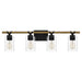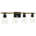 The Devon Court bath light is the perfect companion to industrial or farmhouse-inspired design schemes. This light, which can be configured facing up or down, pairs a matte black finish with a rustic wood accent. Clear glass cups â available in one-, two-, three- or four-light configurations â finish the look.