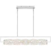 Polished chrome and sparkling crystal glass make an elegant pairing in Klass. An integrated LED light source is included, enhancing the glittering effect of the clear crystal glass. Part of the popular Platinum by Quoizel collection, the Klass linear chandelier is a perfect addition to any modern or contemporary kitchen island or bar area.