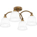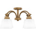 Classic meets transitional in the Iota semi-flush mount. A simple weathered brass frame is accentuated by unique joint accents, adding a touch of modern industrial style. Opal glass shades complete the timeless look, emitting a warm ambient glow in a breakfast nook, kitchen, home office, or over a small table.