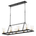 The Paxton linear chandelier combines contemporary styling with idyllic rural undertones. The Modern Farmhouse style is further heightened by the fixture`s geometric influence, given its boxed frame. The two-toned Noir and Aged Brass finishes create a charming effect that helps keep the light firmly grounded in its unassuming rustic aesthetic. Showcasing eight medium base sockets, exposed by the cone-shaped, stone seeded glass shades, this luminary is equipped for either incandescent or dimmable LED A19 bulbs. A chain hung suspension system with stem support framing converges to create a triangular shape. Damp listing capabilities give this chandelier added versatility, making it the perfect fixture for your indoor kitchens, dining rooms, living rooms, or entry foyers, as well as outdoor covered patios and grilling areas.