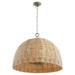 With industrial appeal, this wicker and artisan brass pendant is just the lighting solution that you need for your modern farmhouse design. Formed into a bell-shape with decorative faux screw heads and wood details, this fixture is the epitome of modern nostalgia. Fit for three medium-based 40 watt bulb, this pendant is ideal for any rural or industrial leaning living room, kitchen, or dining room space.