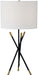 The masterful design of this modern table lamp illuminates interiors with a bit of magic. Three black steel rods, tipped with antique brass plating, form the criss-crossed shape of the decorative lamp base. An off-white linen drum lampshade adds the ultimate finishing touch to this lovely accent light that`s equally appointed as a centerpiece or side table fixture.
