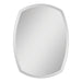 This contemporary mirror has a unique shape that would have a great designer effect in a bathroom. It has beveled and polished edges. The mirror is attached to a backing with strong hangers.