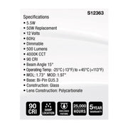 SATCO S12363 MR16 lamps provide high color accuracy with a 90 CRI and are dimmable for customizable lighting. These lamps are also damp location rated, and suitable for use in enclosed fixtures. Perfect for a variety of residential and commercial applications, SATCO MR16 lamps combine efficiency, durability, and high-quality lighting.