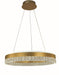 Hazel collection in Brushed Gold in an open round design with illumined at top and bottom with faux crystal accents on bottom, with 50W LED, 3000K integrated bulbs 80+ CRI, 4500 Lumens. Adjustable heights upon installation, dimmable with Triac dimmers. 5 year limited warranty.