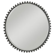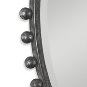 Petite Iron Spheres Line The Outer Edge Of This Round Frame, Finished In A Distressed Black With Silver Highlights And A Light Gray Glaze. Mirror Features A Generous 1 1/4" Bevel.