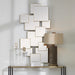 This Mirror Features Overlapping Squares Encased In Brass Plated Channeling That Create A Modern Yet Elegant Feel. May Be Hung Horizontal Or Vertical.