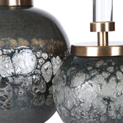 Set Of Two Art Glass Bottles Feature Organic Texture With An Iridescent Blue-gray Hue. Each Bottle Is Paired With A Brushed Brass Plated Lid And Crystal Accent. Sizes: S-5x8x5, L-7x10x7