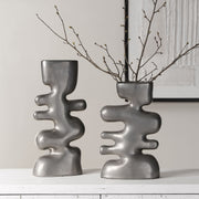 Set Of Two Ceramic Vases Embrace The Iconic Look Of Modern Décor. These Decorative Vases Feature A Free Flowing, Carefree Design Finished In A Tarnished Nickel Glaze. Suitable For Placement In Most Any Room, These Can Simply Be Displayed Alone Or Add Some Florals For A Touch More. Sizes- S- 8x12x4, L- 7x14x4