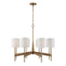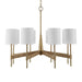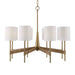 A Sophisticated Casual 8 Lt Chandelier Featuring Rattan Wrapped Arms Dressed Up In A Warm Brass Finish Complimented With White Linen Hardback Fabric Shades. 8-60 Watt Max Candelabra Sockets. Bulbs Not Included. Supplied With 20' Wire, 7' Chain For Adjustable Installation.