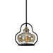 Updated Mini Pendant With Curvaceous Accent Tubing That Follows The Contour Of The Light Amber Glass Shade. Rod Hung In An Aged Black Iron Finish With Antiqued Brass Plated Details. 1-100 Watt Max, Edison Socket. Bulbs Not Included. Supplied With 15' Wire, 3-12" Stems And 1-6" Stem For Adjustable Installation.