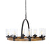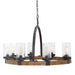 Heavy Gauge Real Wood Frame Wooden Wagon Wheel, Finished In A Mid-tone, Featuring Clear Seeded Glass Shades. A Nod To Industrial Design Is Found In The Iron Wrapped Frame, And Large Circular Hook. The Metal Work Is In A Deep Weathered Bronze Finish With A Slight Texture And Black Antiquing. 8-60 Watt Max, Edison Sockets. Bulbs Not Included. Supplied With 20' Wire And 7' Chain For Adjustable Installation.